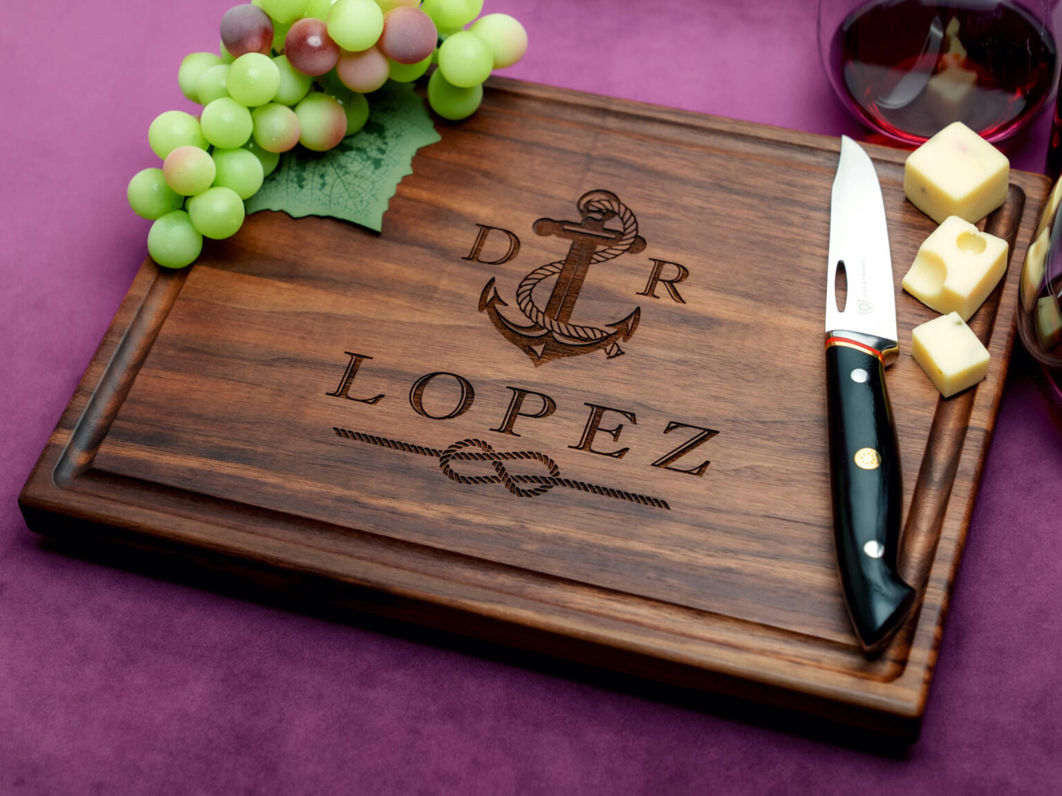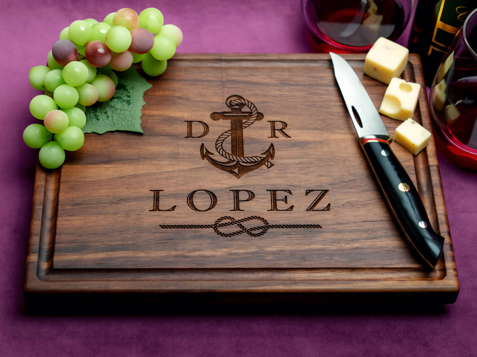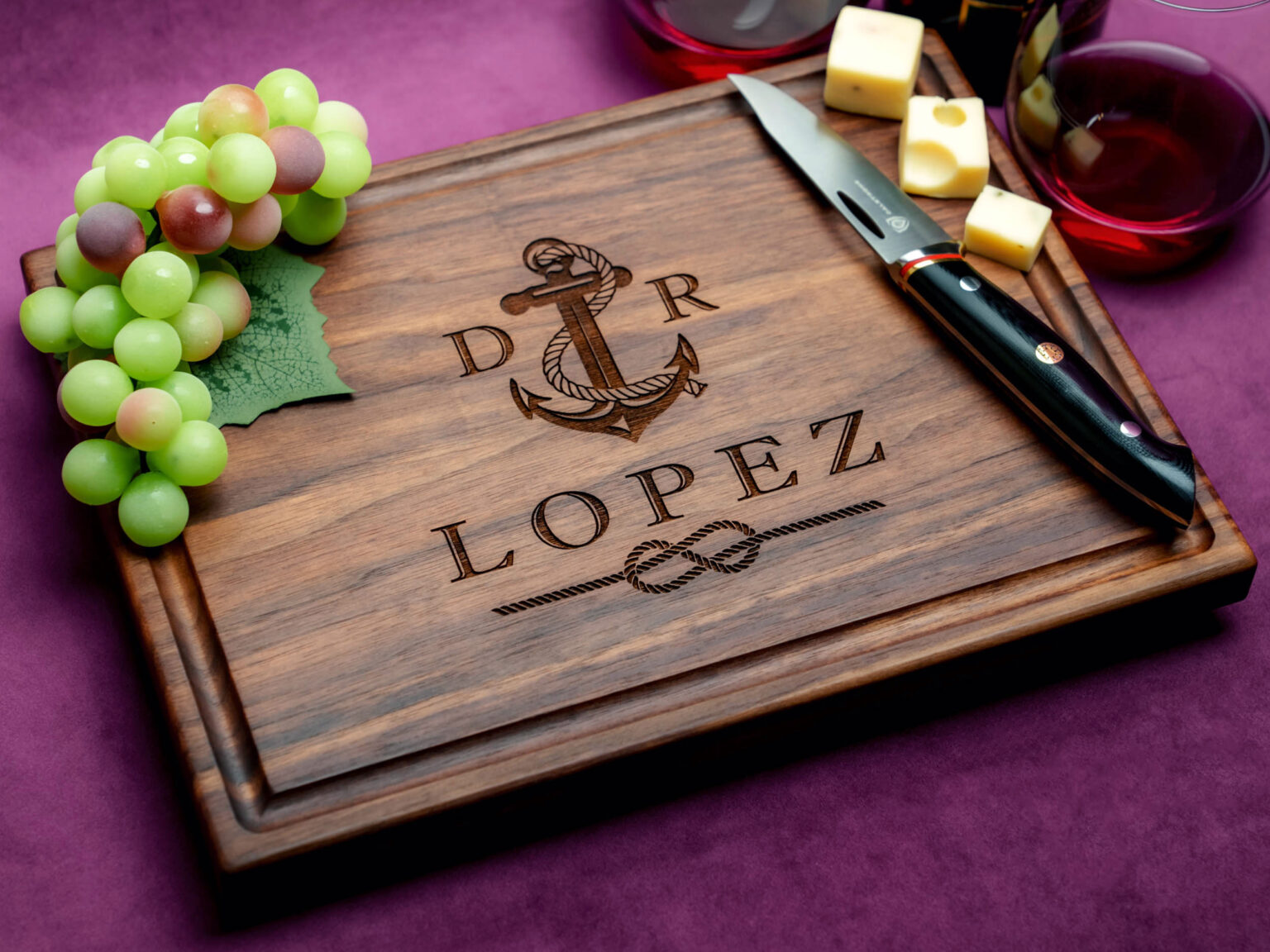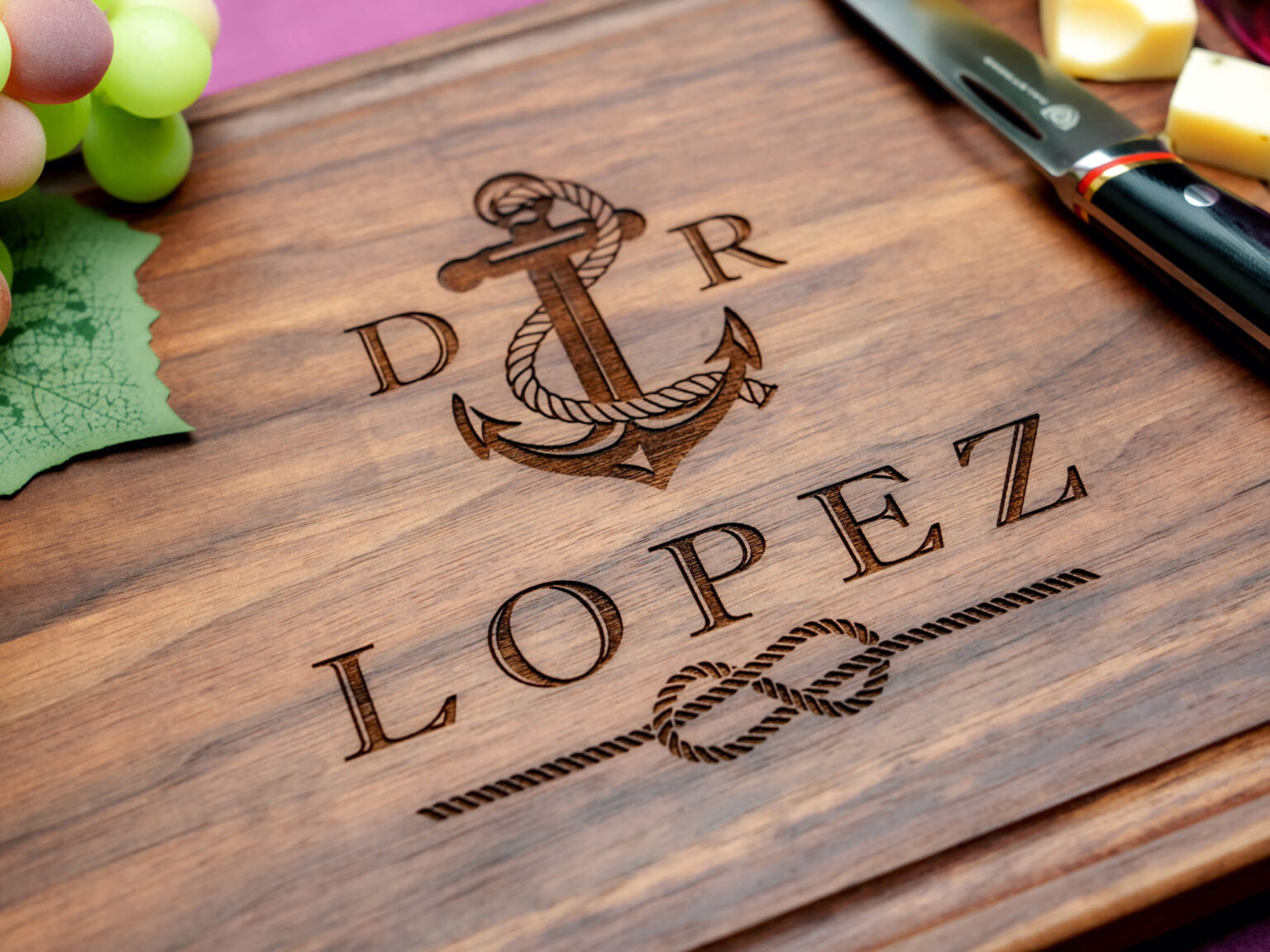 Crafted with exceptional precision, the design features a beautifully intricate nautical anchor entwined with a tied knot, along with your chosen initials. These two initials add a personal touch, turning the cutting board into a one-of-a-kind piece that’s as meaningful as it is stunning. Picture the delight on their face as they unwrap this thoughtfully crafted gift that brings together their love for the sea with your personalized touch.