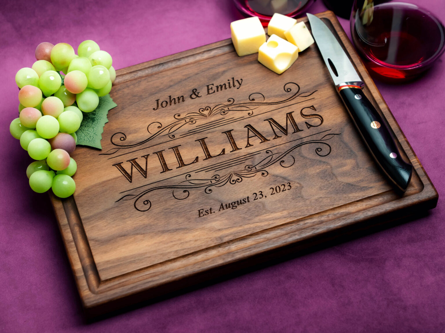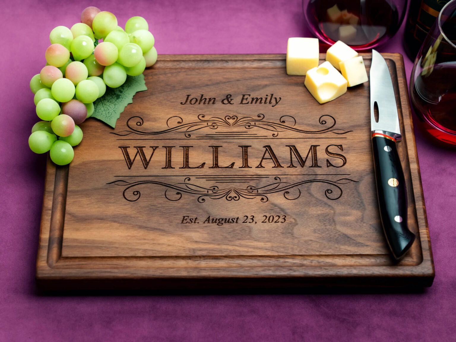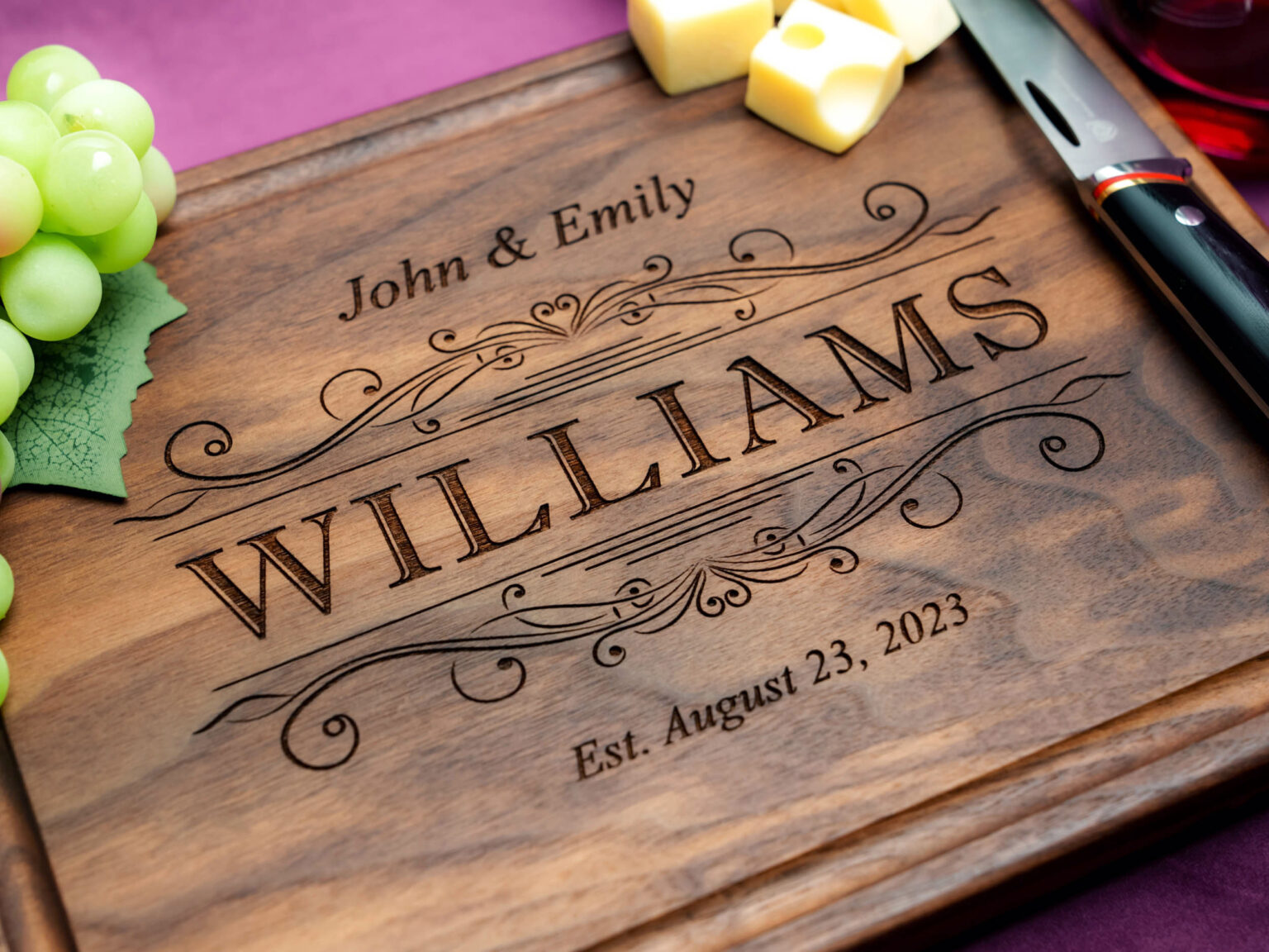 This custom cutting board is an exceptional anniversary or housewarming gift, and it’s one of our most popular products. Choose the size and type of wood that suits you best, and we will engrave your personalized design with precision and care.