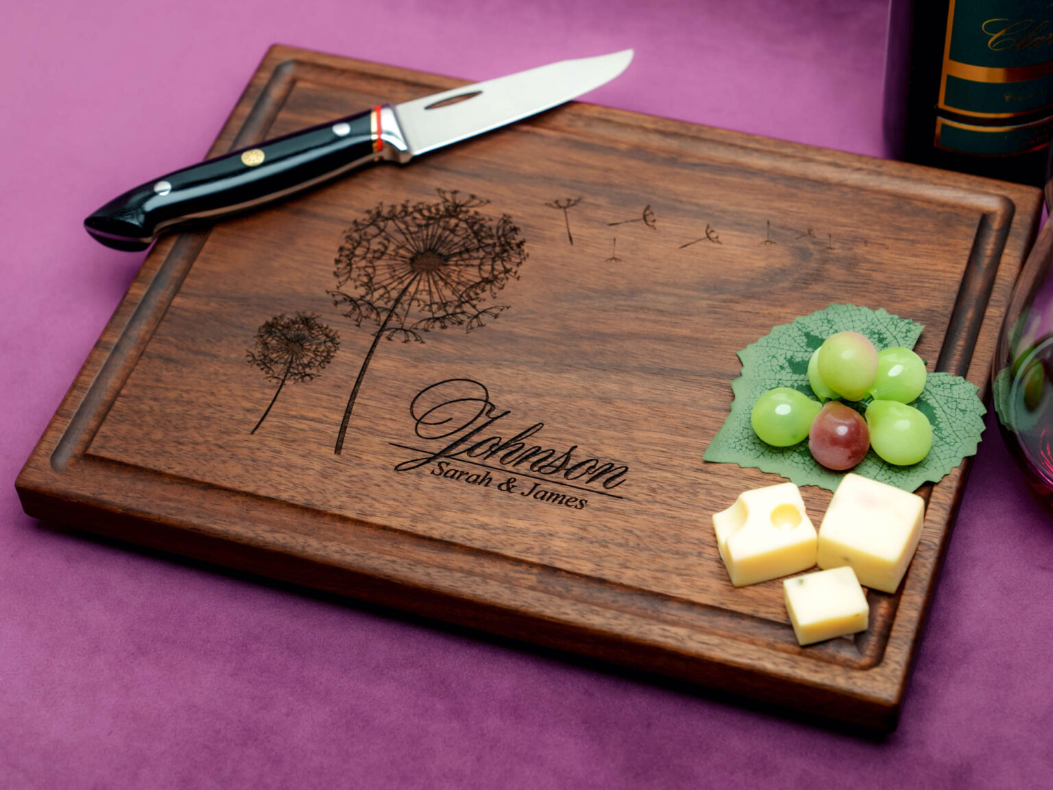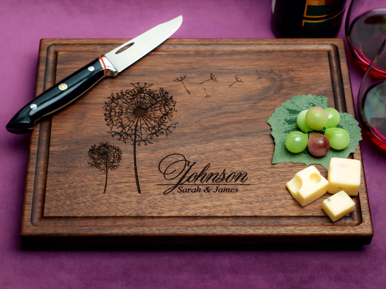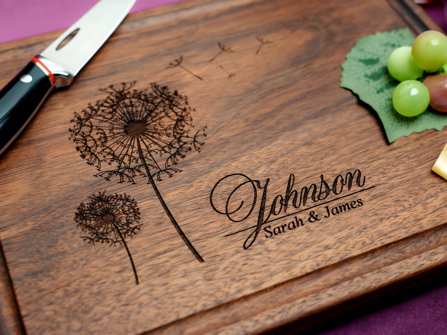 Made with the highest quality materials, our custom cutting board features a beautifully intricate dandelion design that adds a touch of elegance to any culinary space. With its personalized touch, you can further customize the board with the couple’s names or initials, making it a truly one-of-a-kind present.