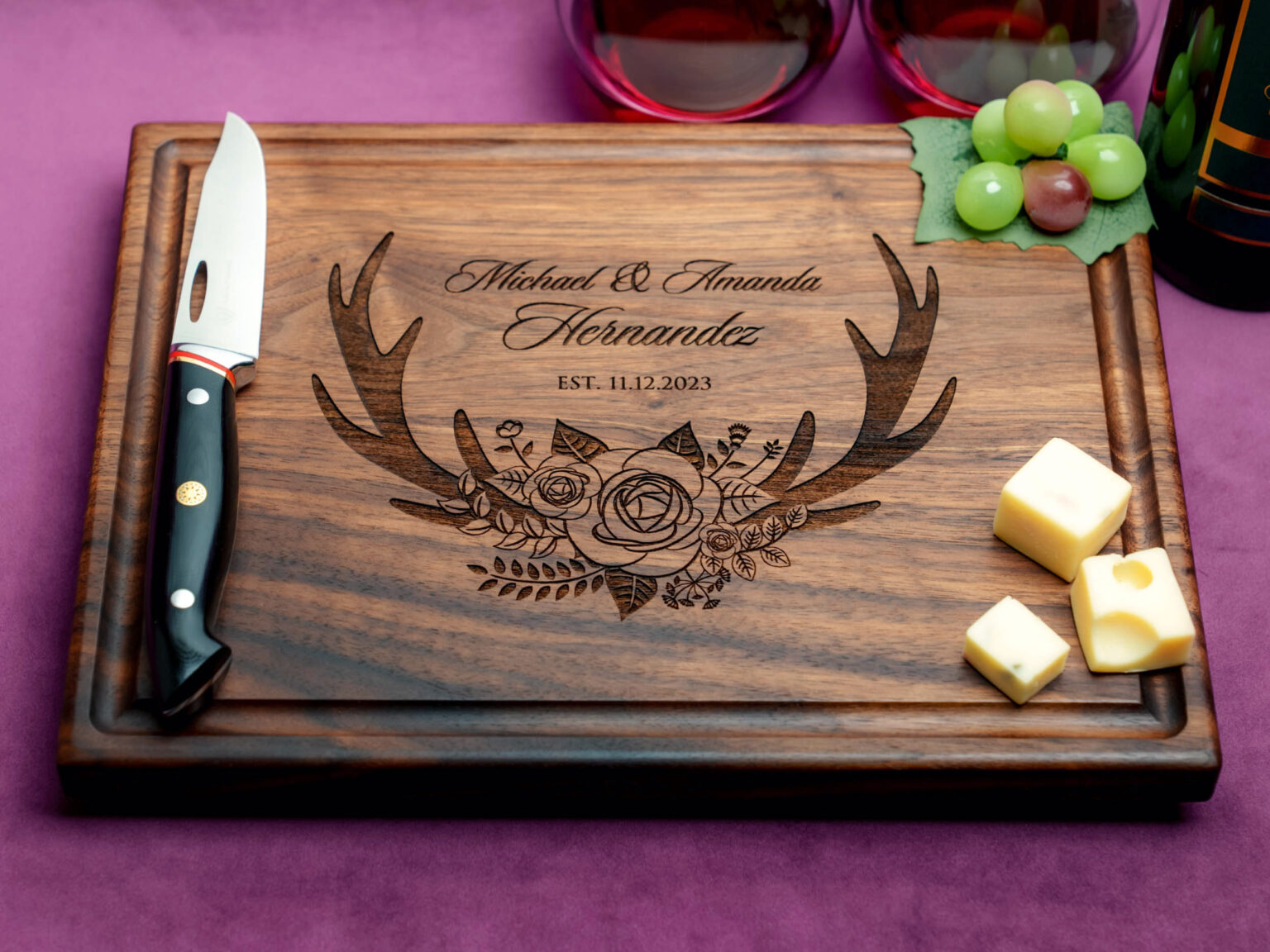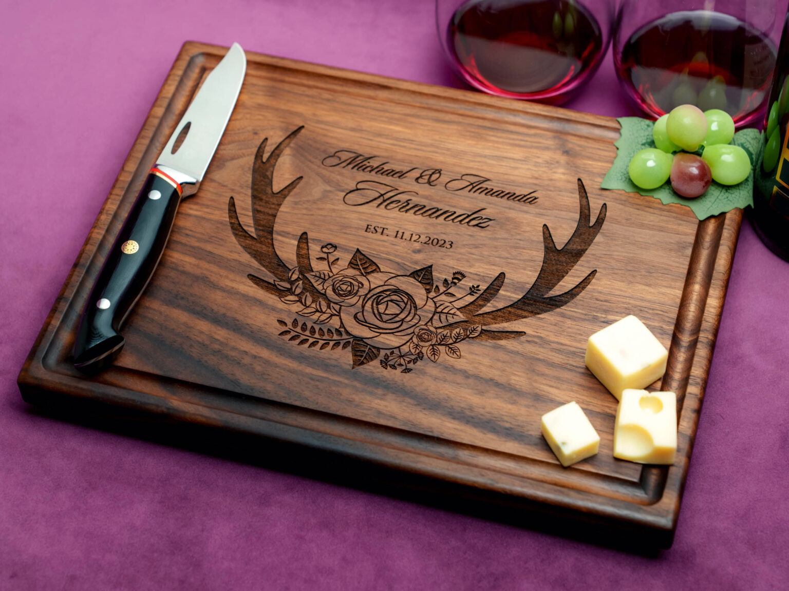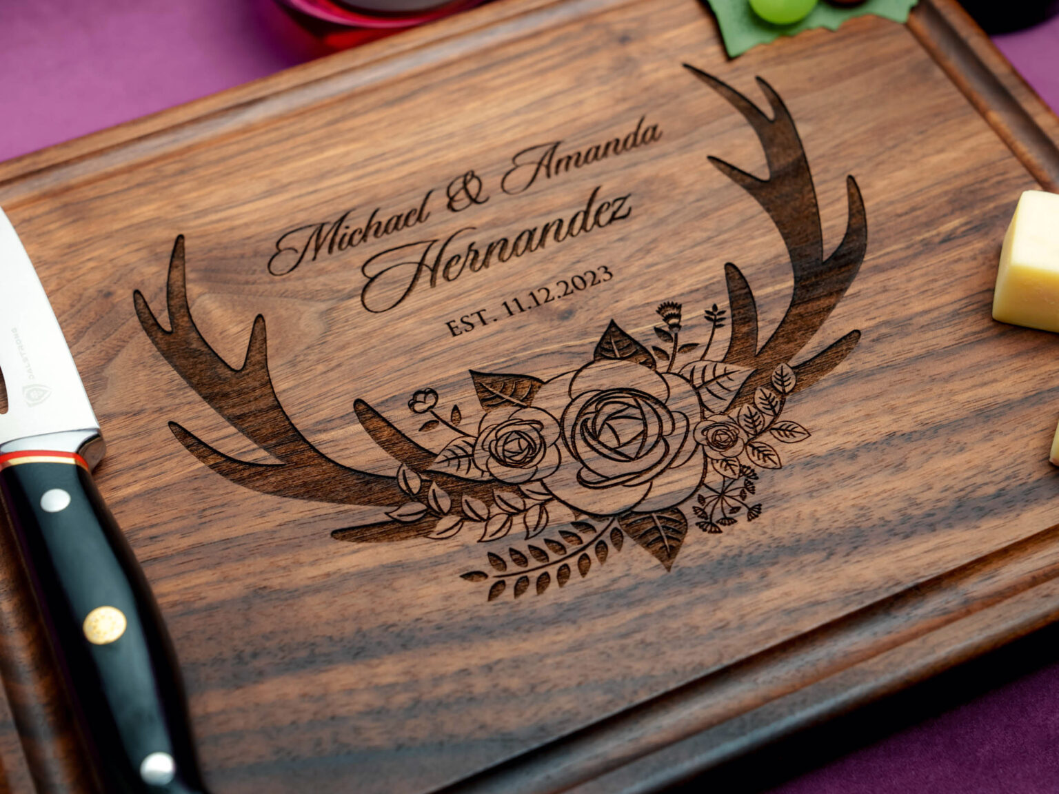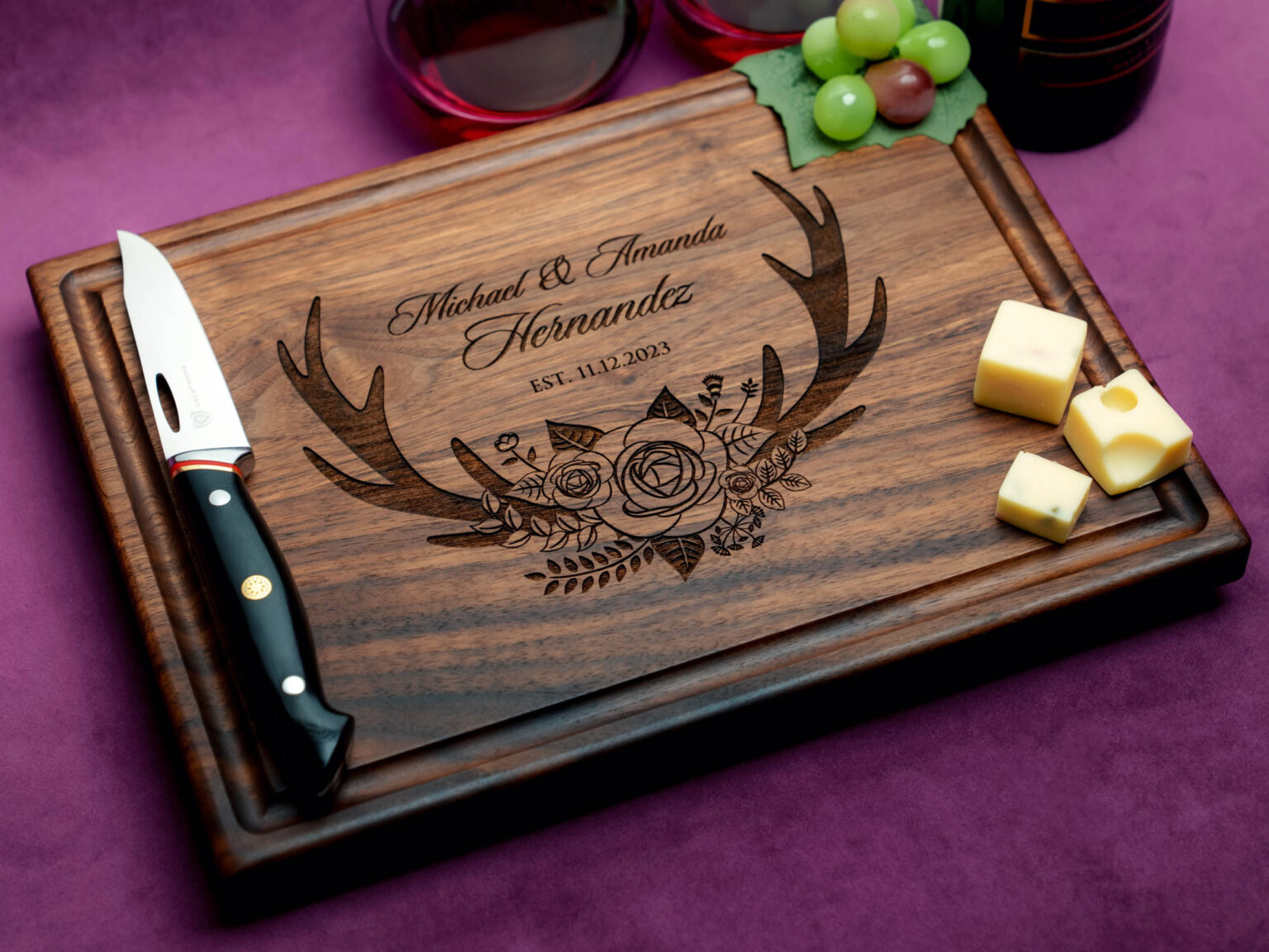 Our custom cutting board features an enchanting design that seamlessly blends delicate flowers with majestic antlers, creating a rustic elegance that will capture anyone’s attention. This unique piece brings nature’s charm into the kitchen in a way that’s both stylish and thoughtful.