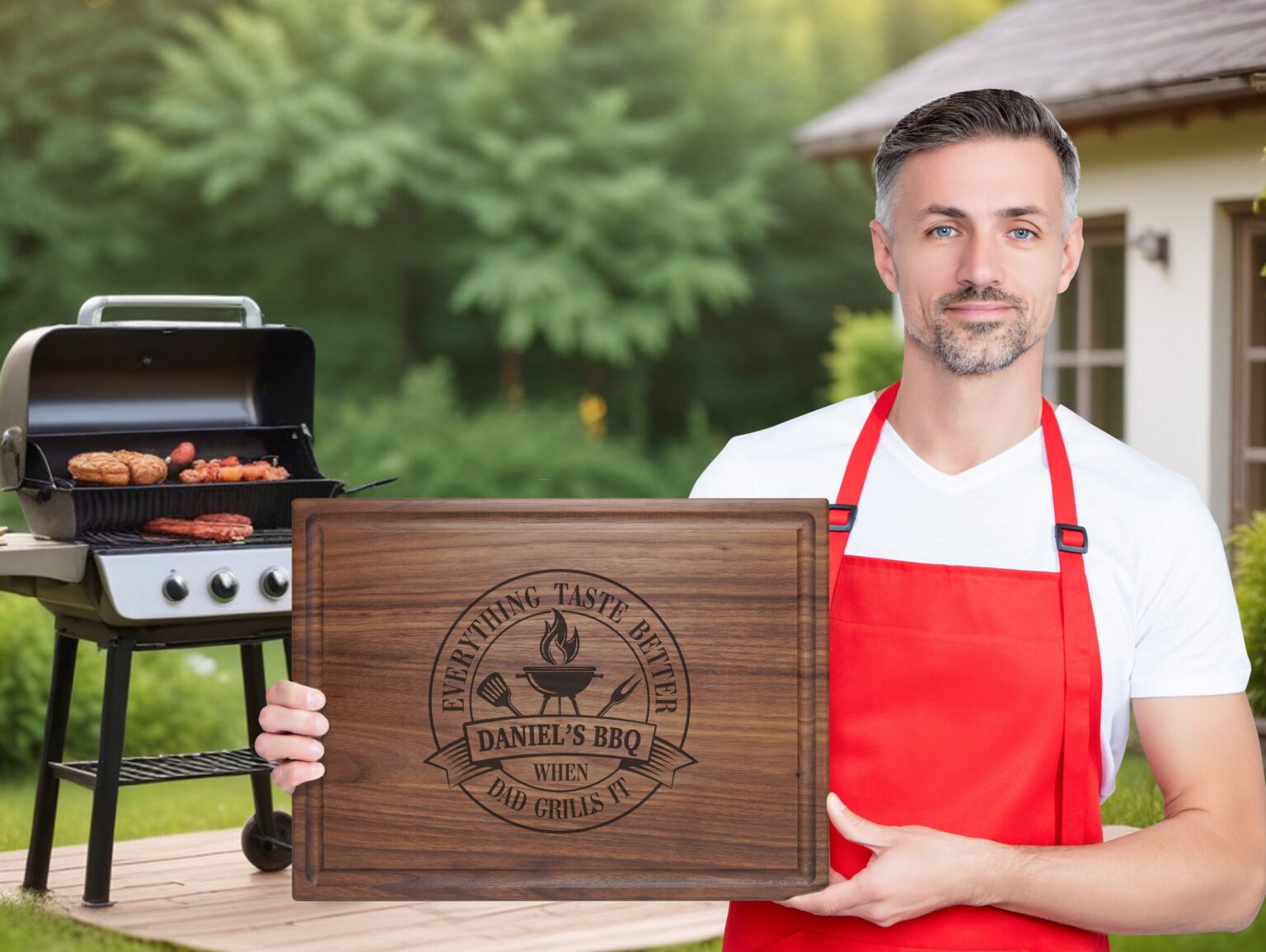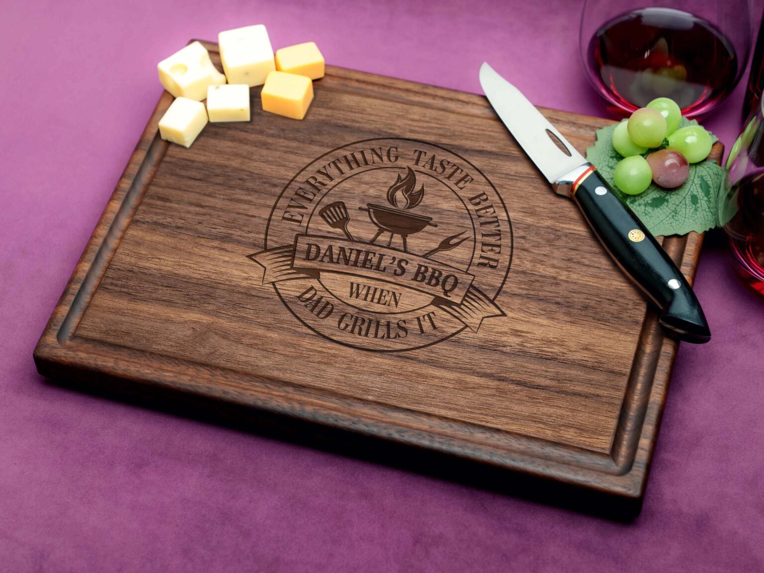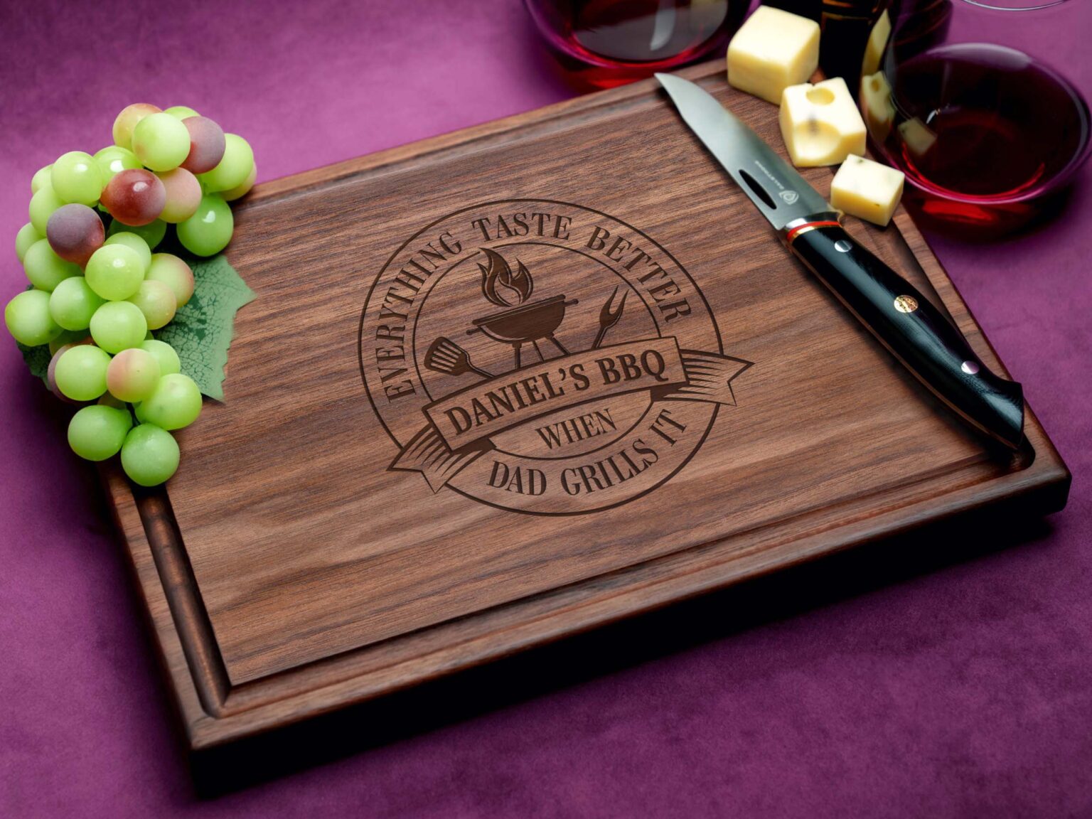 Made from high-quality walnut, mahogany, and bamboo wood, this custom cutting board is not only a practical tool but also a stunning piece of art. Our skilled artisans have carefully engraved the “Everything Taste Better When Dad Grills It” Design, highlighting the importance of family bonding and creating lasting memories around the grill.