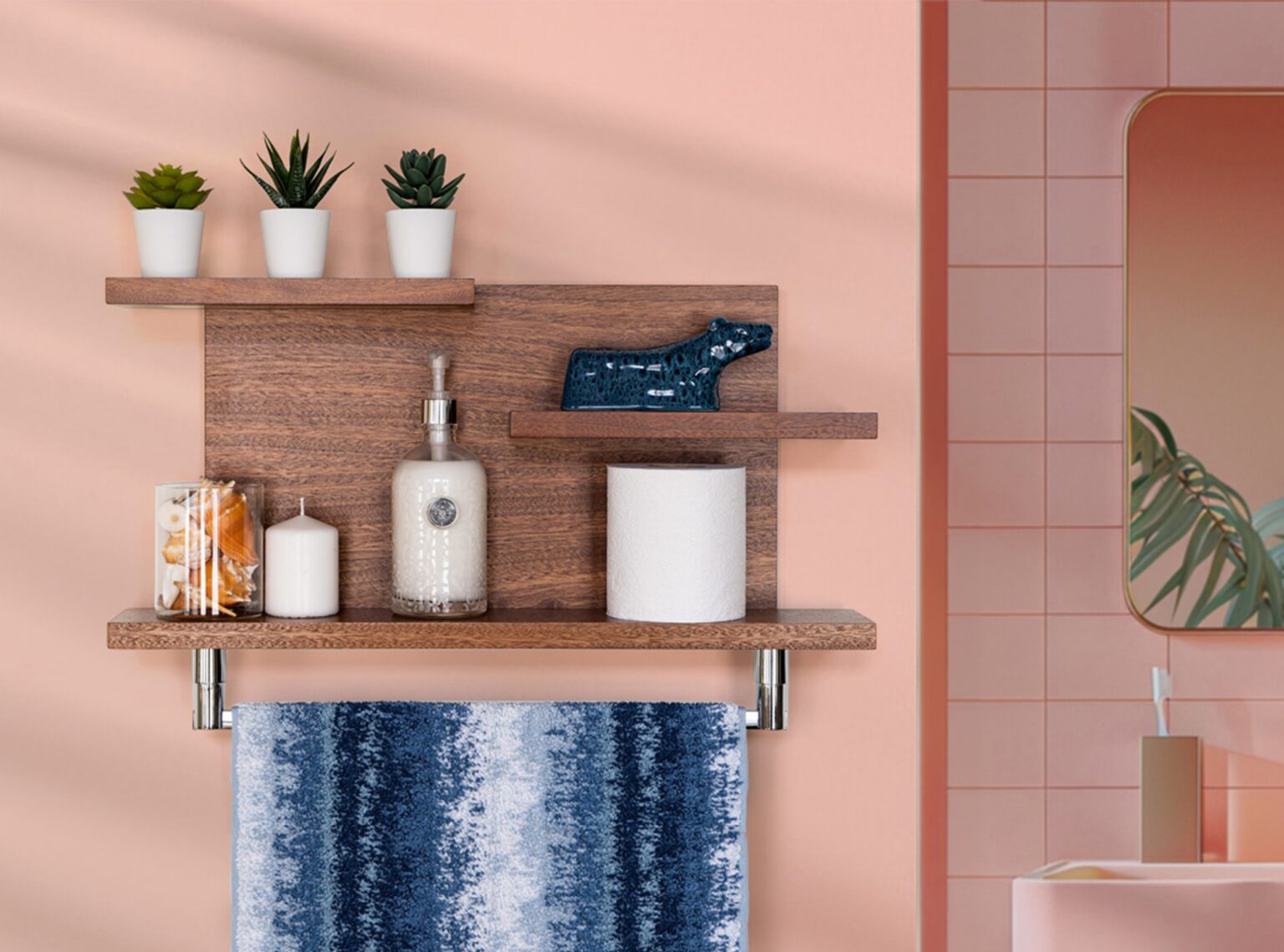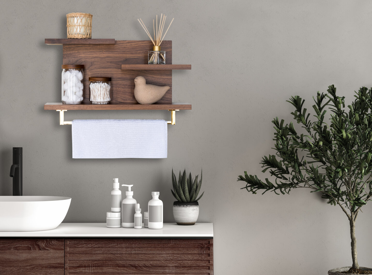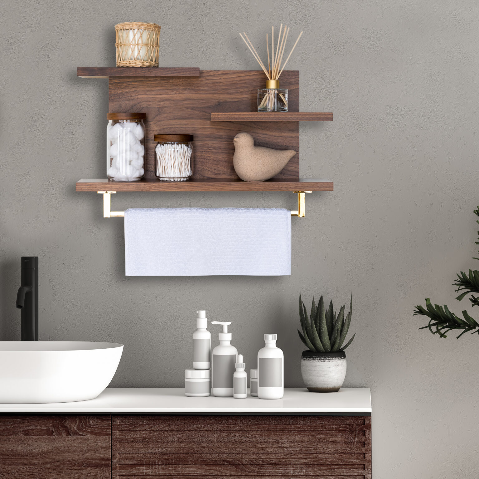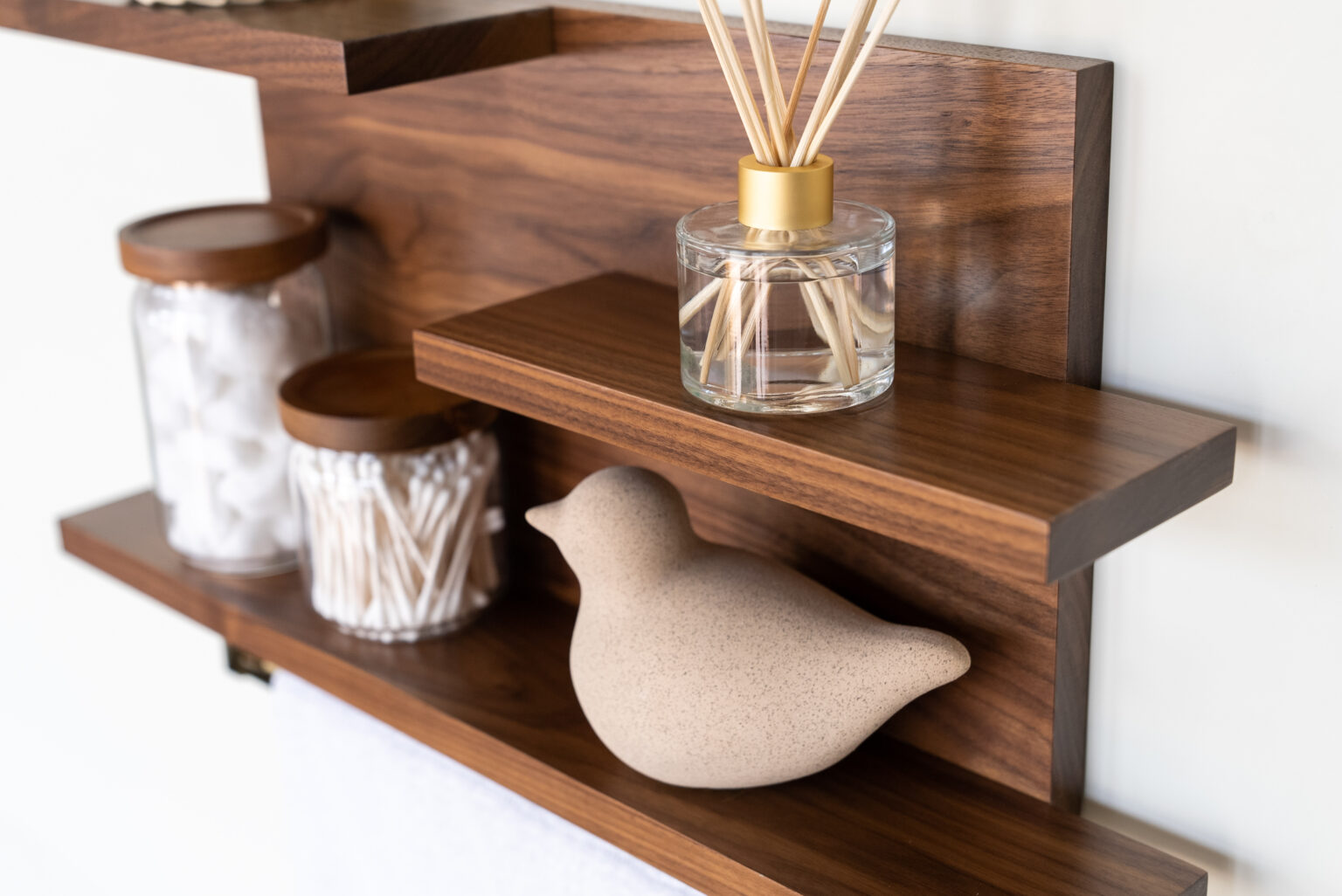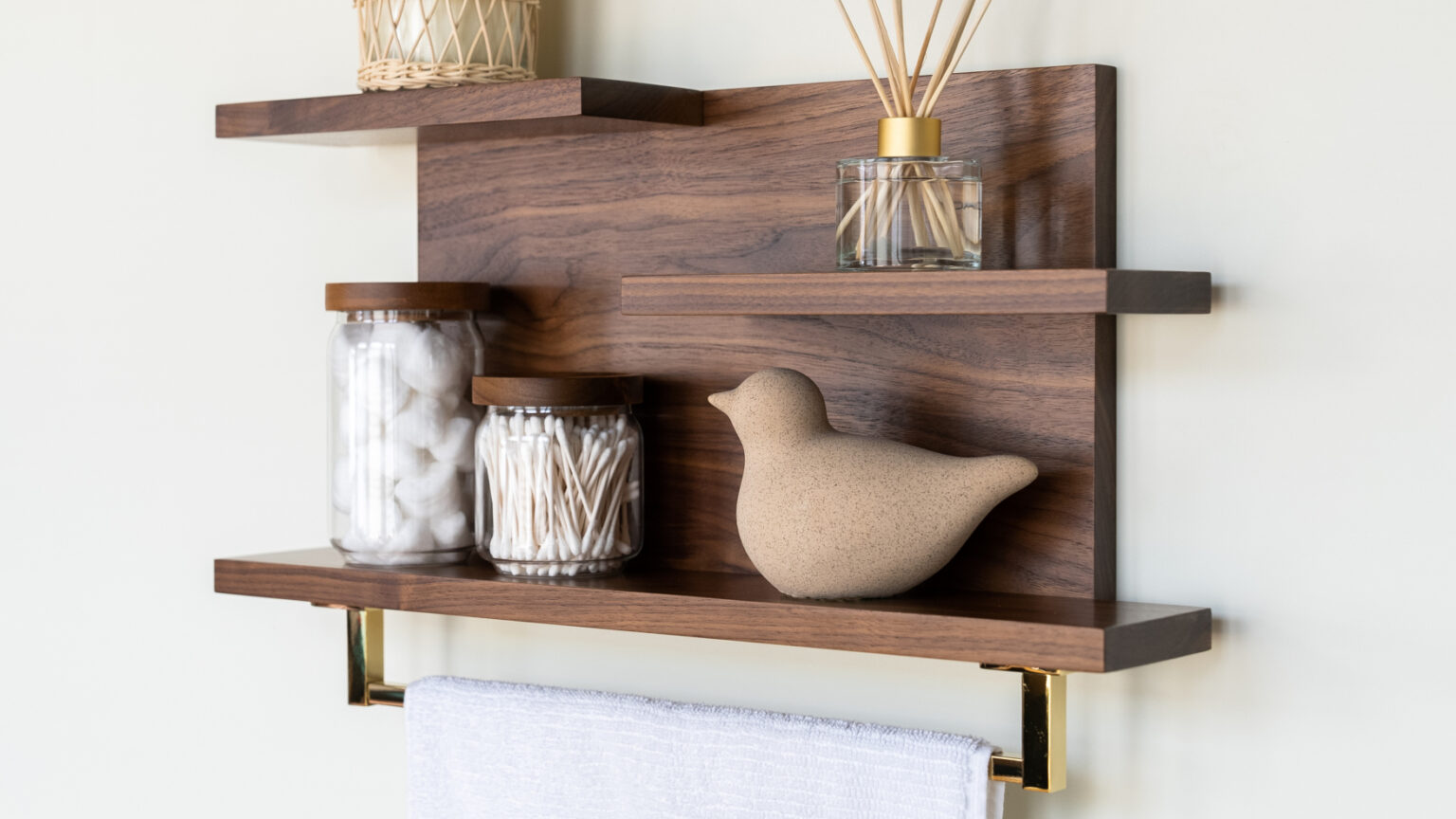 With minimalist and modern lines, this handmade hardwood shelf offers three versatile storage surfaces and an ultra-handy towel rod in your choice of finish. It’s perfect for hanging towels and displaying various knickknacks, making it a great addition to any home, apartment, or condo. This organizer not only helps elevate your space by keeping it clean and organized but also adds an elegant and timeless touch to your powder room or bathroom.