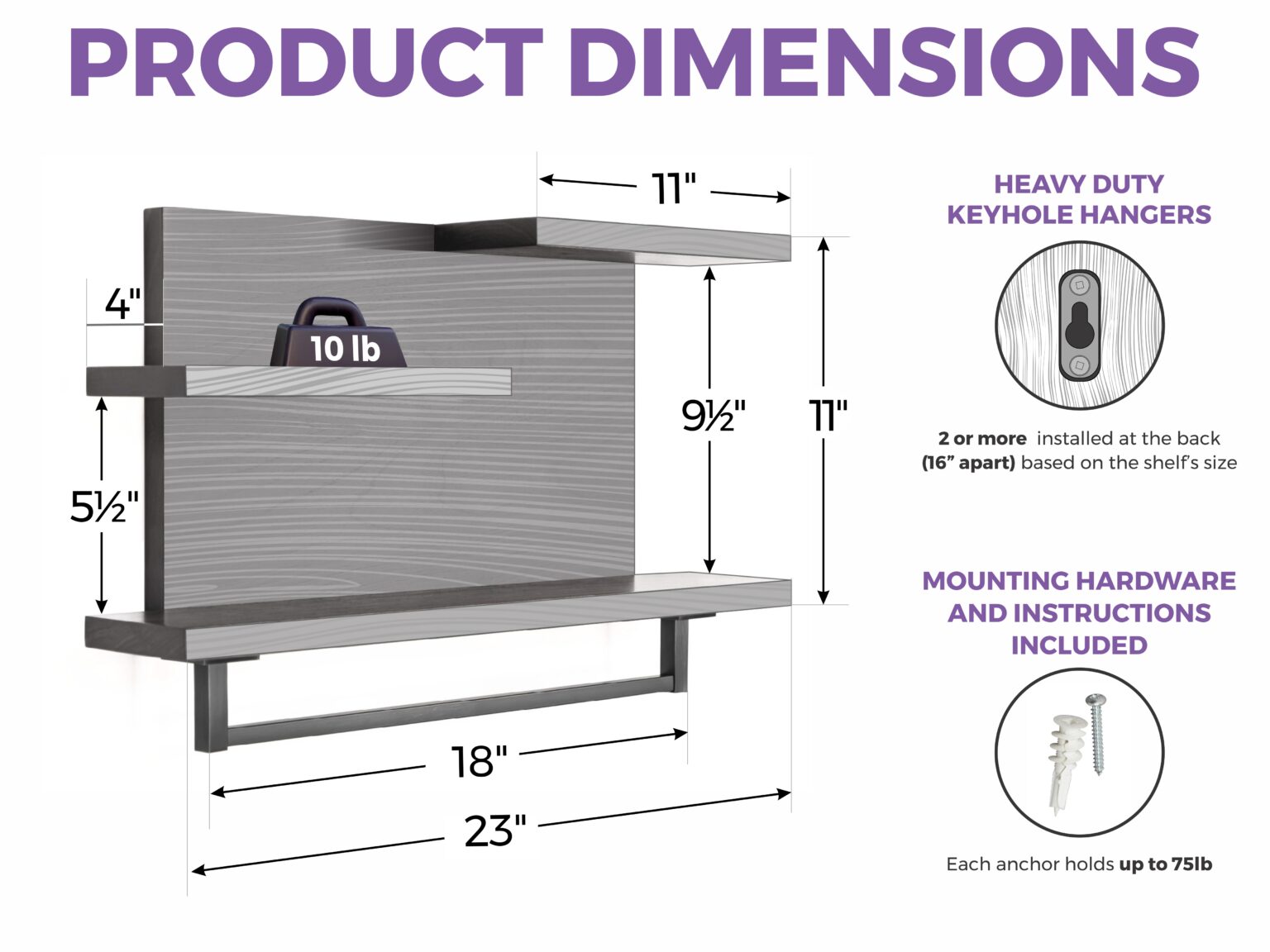 This piece does not include the accessory items shown in the pictures. Please use our “Wood Selection” image in the listing to reference hardwood color. Hardwood color captured in the photos might vary due to the natural non-stained origin of the hardwood. Keyhole hangers are installed on the back 16” apart with heavy-duty mounting screws and anchors included for easy installation.
