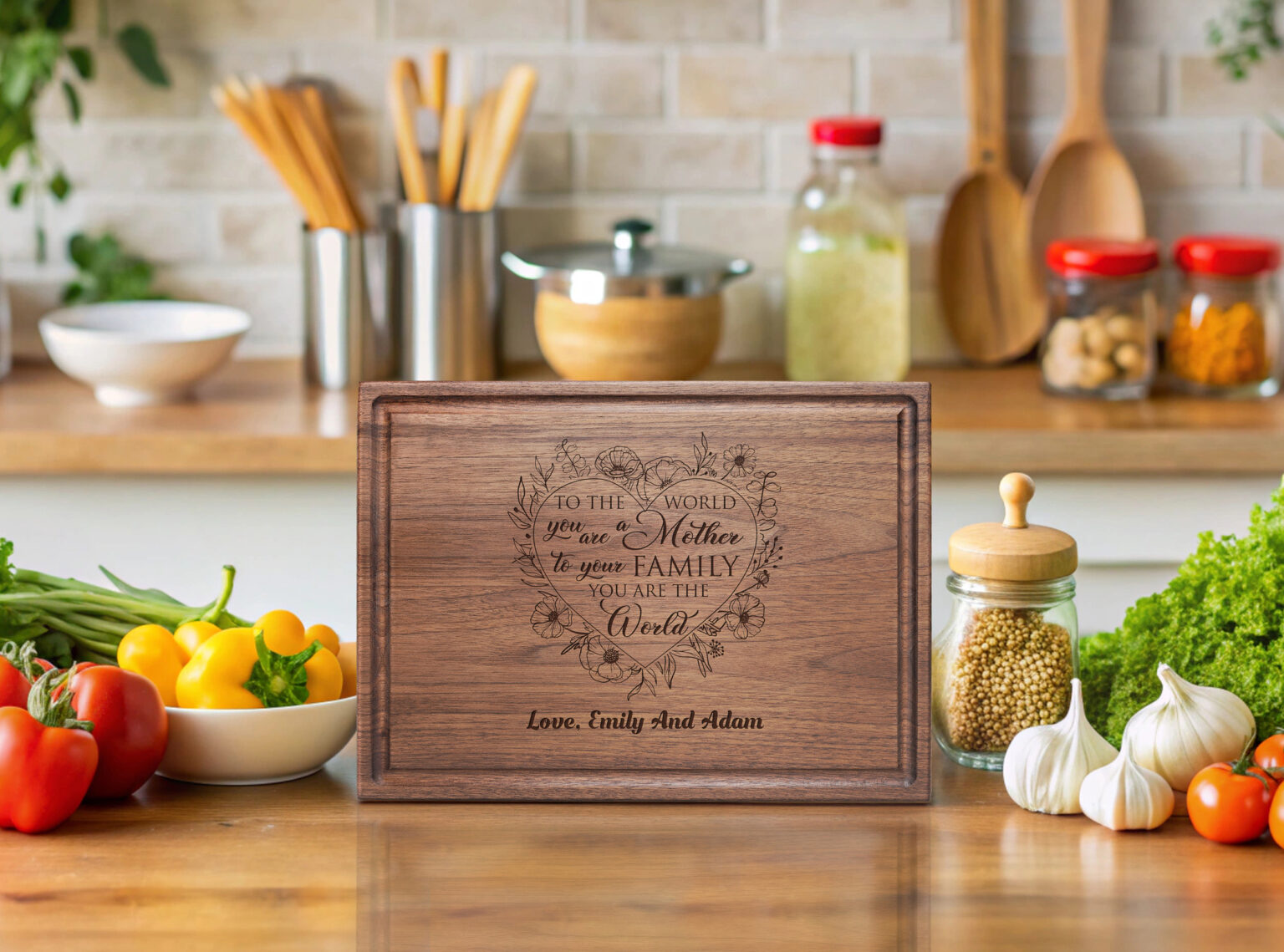 Crafted from high-quality walnut, mahogany and bamboo, this cutting board is not only durable but also showcases a stunning combination of natural wood grains. Each piece is carefully engraved with the words Mom Floral Heart Design adding a touch of warmth and nostalgia to any kitchen.