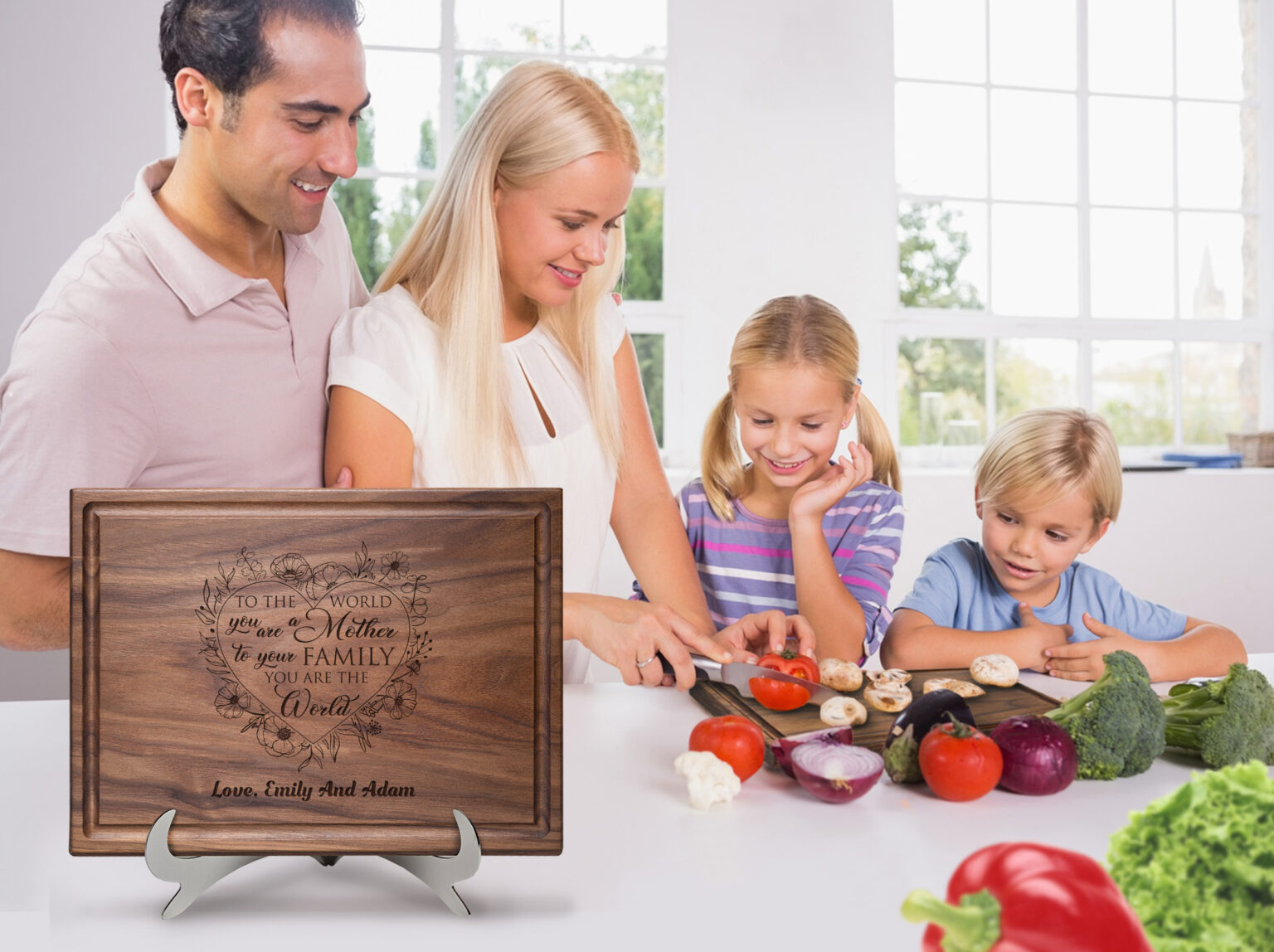 Looking for the perfect personalized gift for mom? Look no further than our exclusive Mom Floral Heart Design cutting board from Straga Products. This beautifully engraved and customized cutting board is not only functional but also a sentimental reminder of the importance of family and the love between a mother and her children.