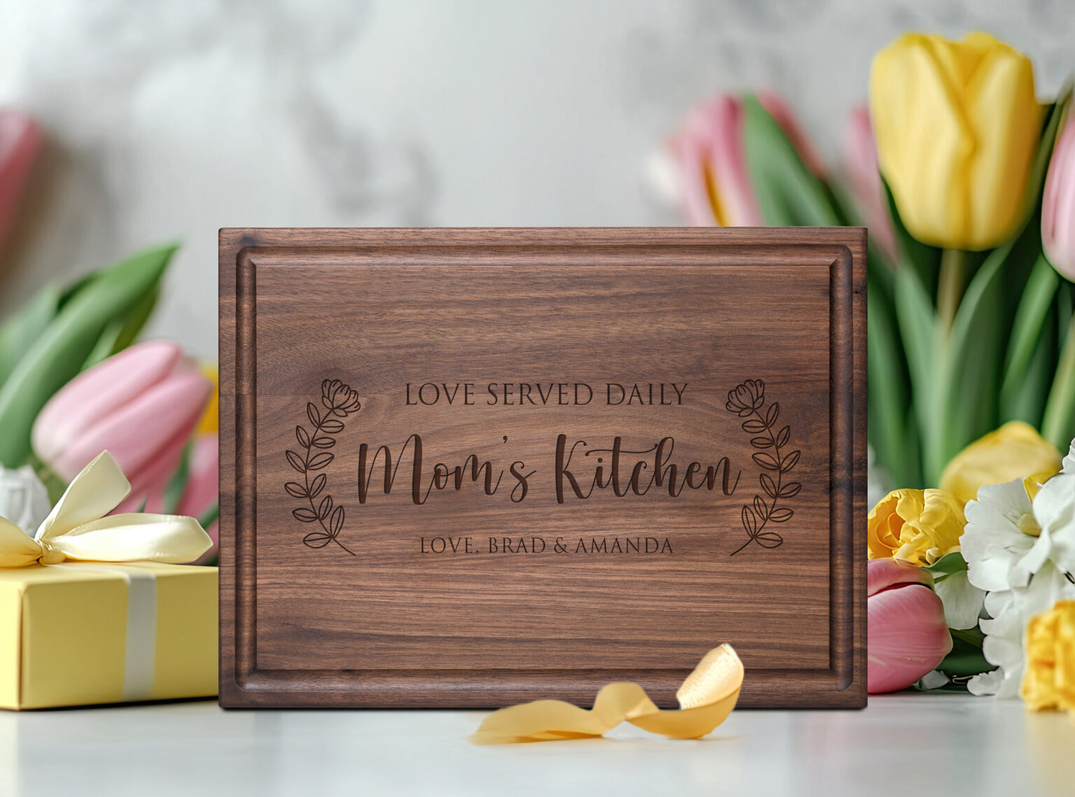 Looking for the perfect personalized gift for mom? Look no further than our exclusive Mom’s Kitchen Love Served Daily Design cutting board from Straga Products. This beautifully engraved and customized cutting board is not only functional but also a sentimental reminder of the importance of family and the love between a mother and her children.