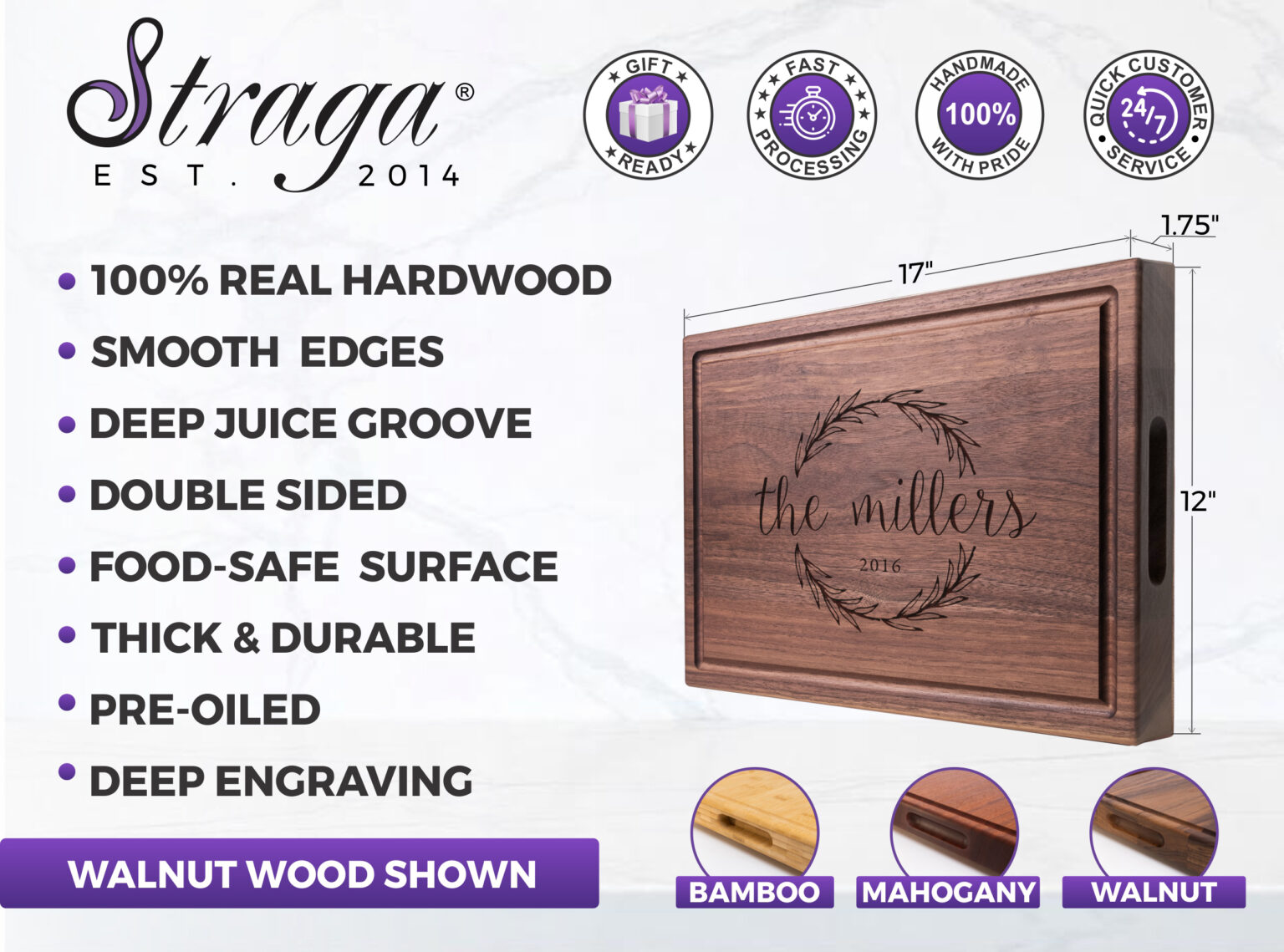 Looking for the perfect gift? Our personalized chopping blocks make a thoughtful and unique gift for weddings, anniversaries, birthdays, housewarmings, or any special occasion. With the option for custom engravings, you can personalize each board with names, dates, or messages to make your gift truly one-of-a-kind. Choose from various fonts and designs to match the recipient’s style. We also offer premium gift wrap, a personal gift note, and a sturdy tote bag to ensure your gift is presented in the most memorable way.