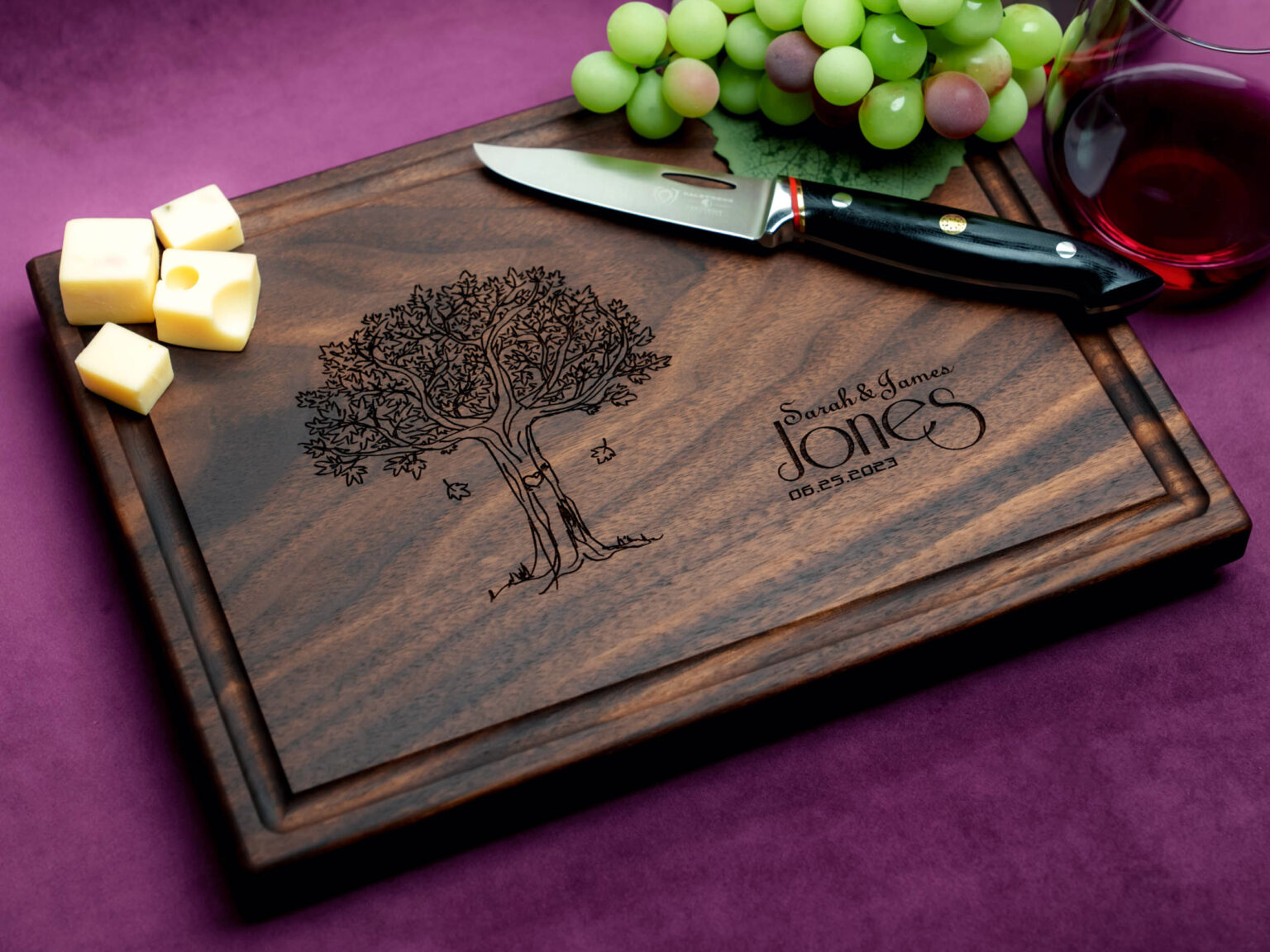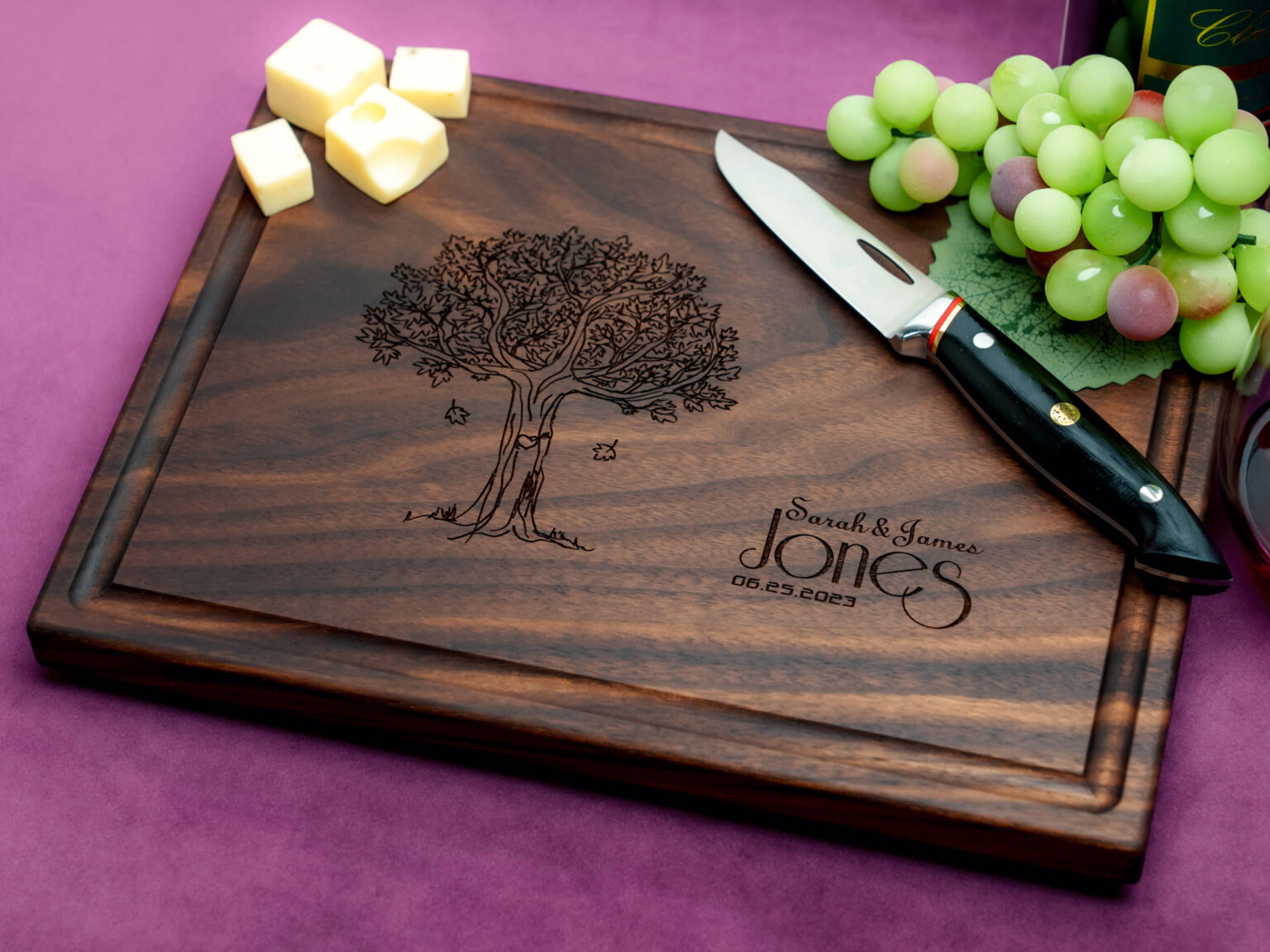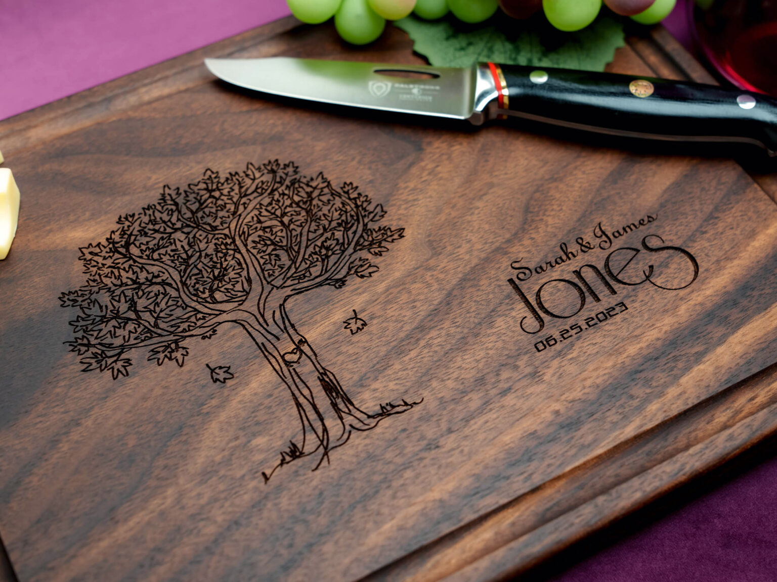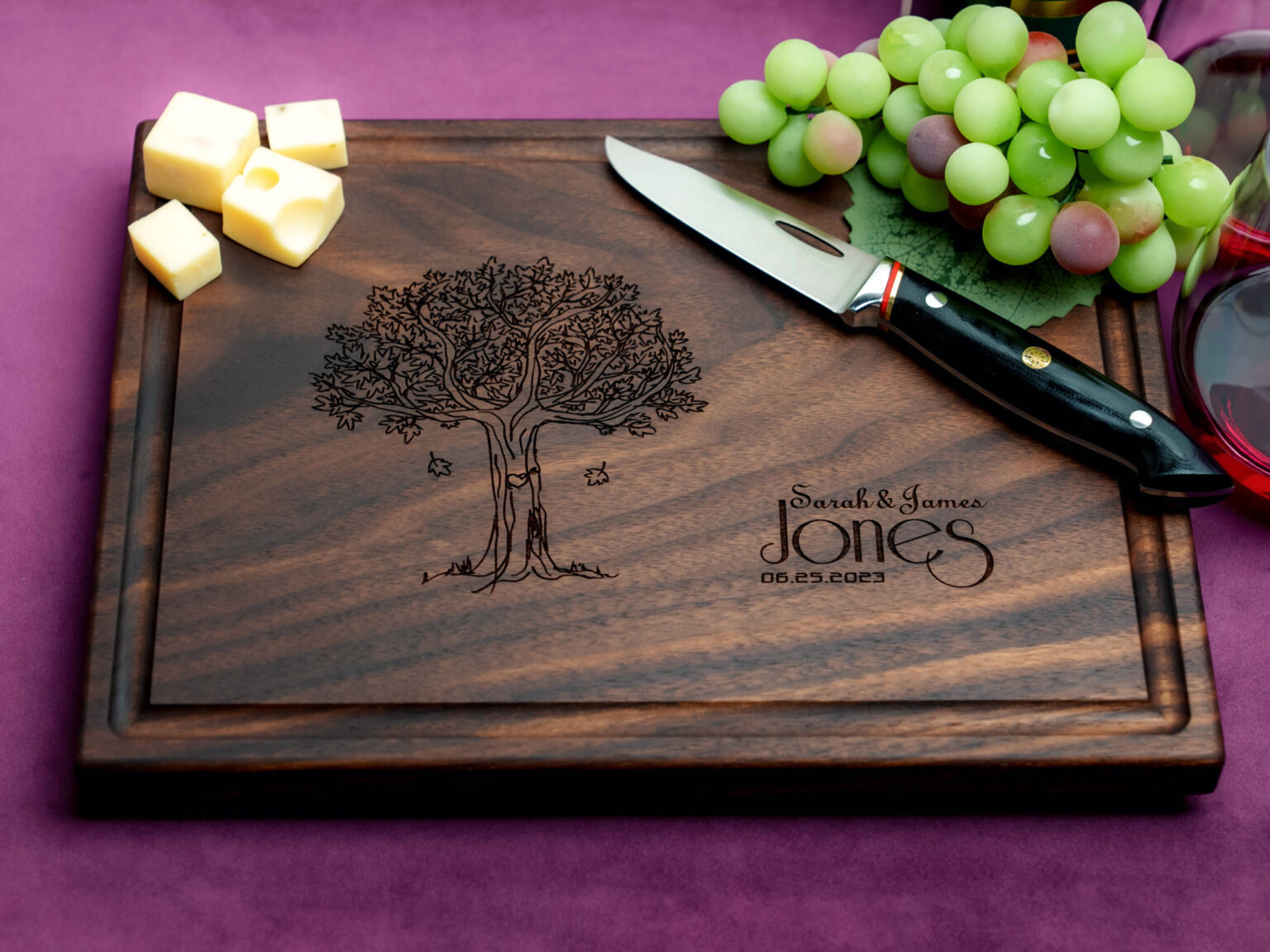 The Personalized Cutting Board with Couples Tree Design is an ideal gift for those who value uniqueness and the finer things in life. This cutting board is designed with a beautiful tree that adds a touch of elegance to any kitchen. The design is further enhanced by the option to add a date of your choice, giving it an additional personal touch.
