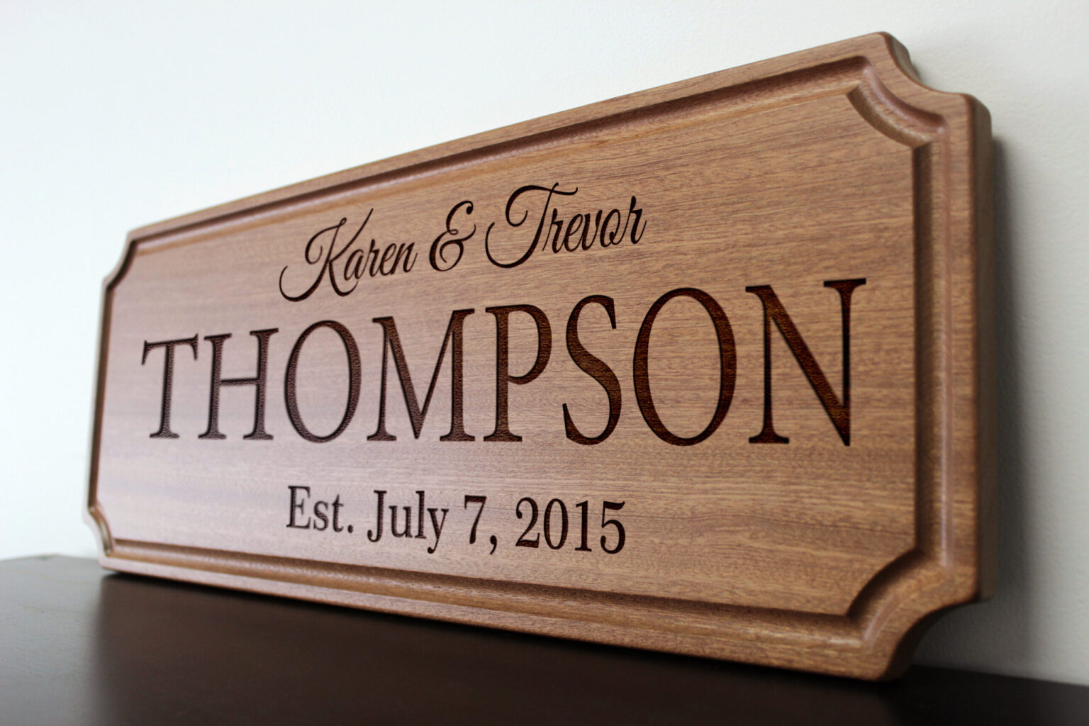 Our wooden signs make the perfect engagement, wedding, anniversary gift, or home décor keepsake. This personalized last name sign is available in solid 3/4″ thick, highest grade Walnut, Sapele and Maple wood and measures: 23″ x 9″