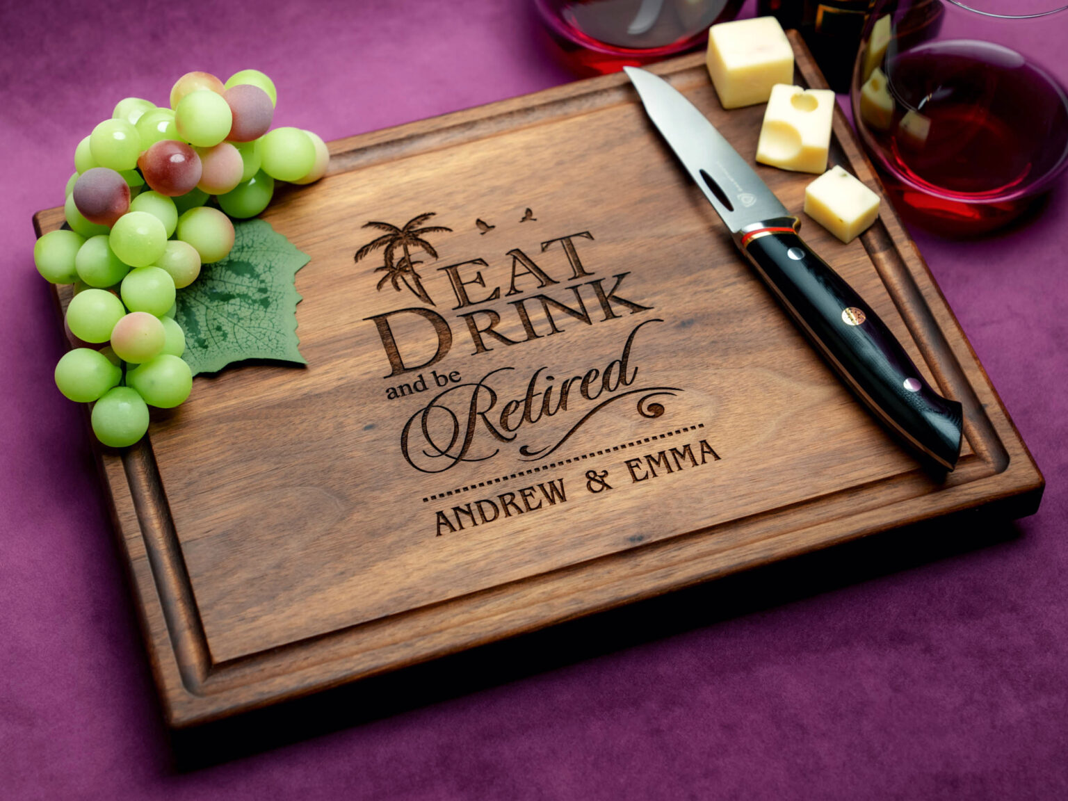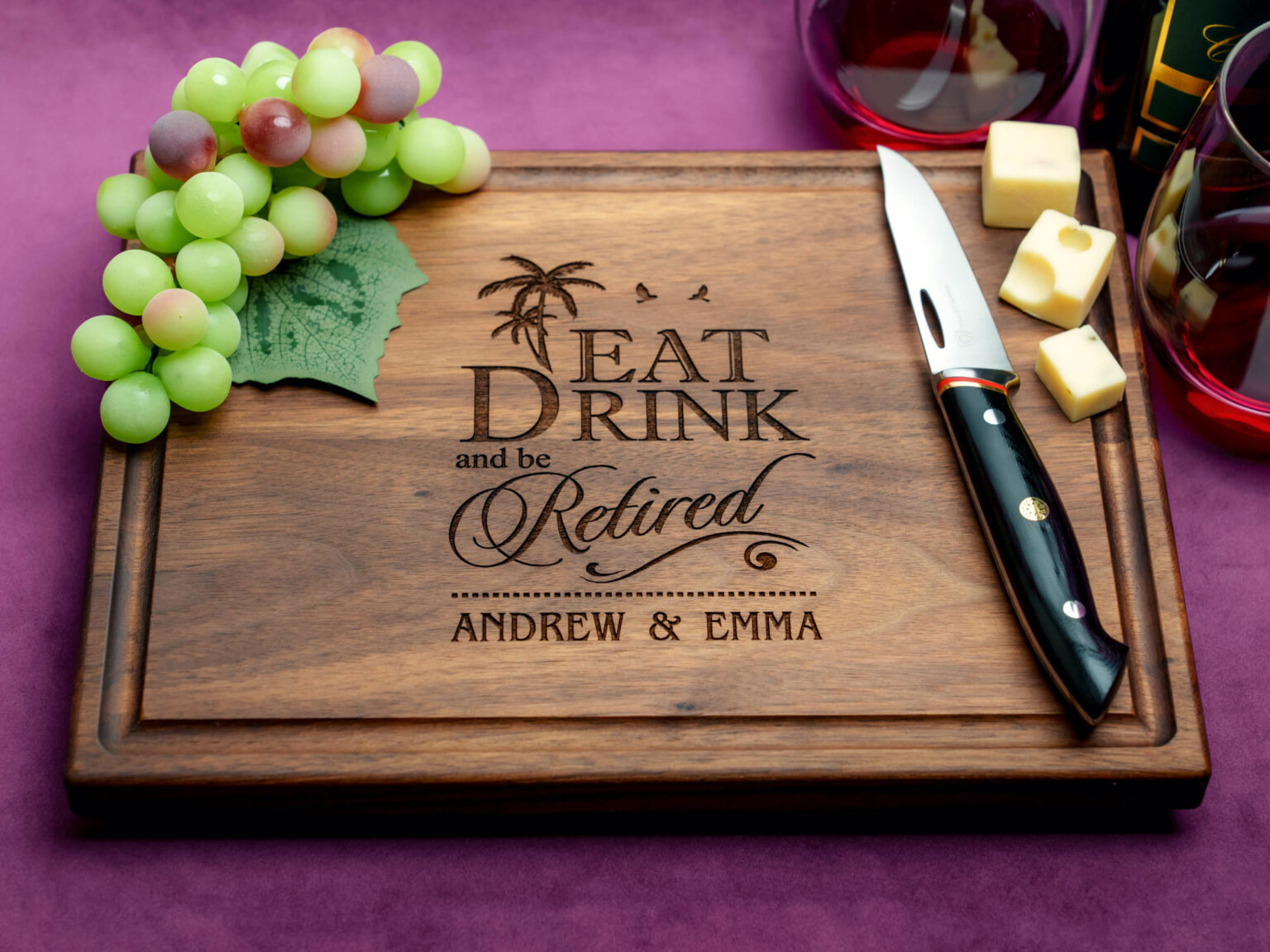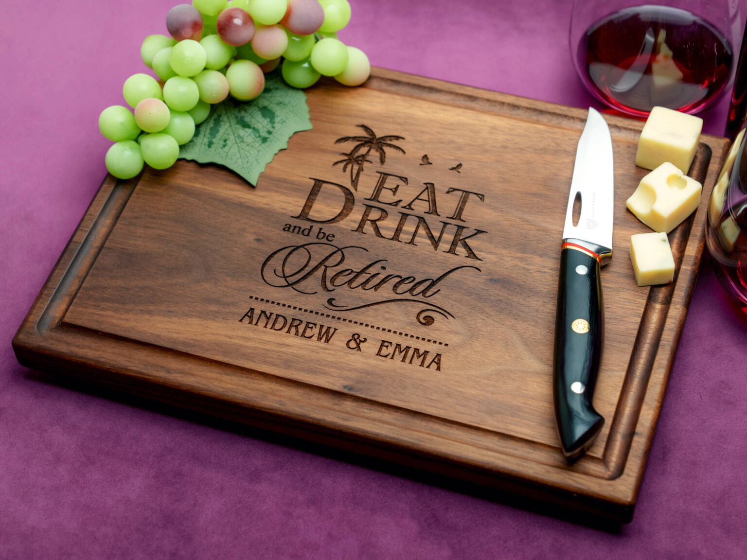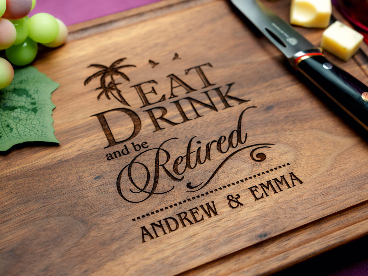 Made from the finest walnut, mahogany, and bamboo, this cutting board showcases a stunning tropical retirement design that is engraved directly onto the surface. Each detail beautifully captures the essence of a well-deserved retirement in paradise, making it a truly unique and thoughtful present.