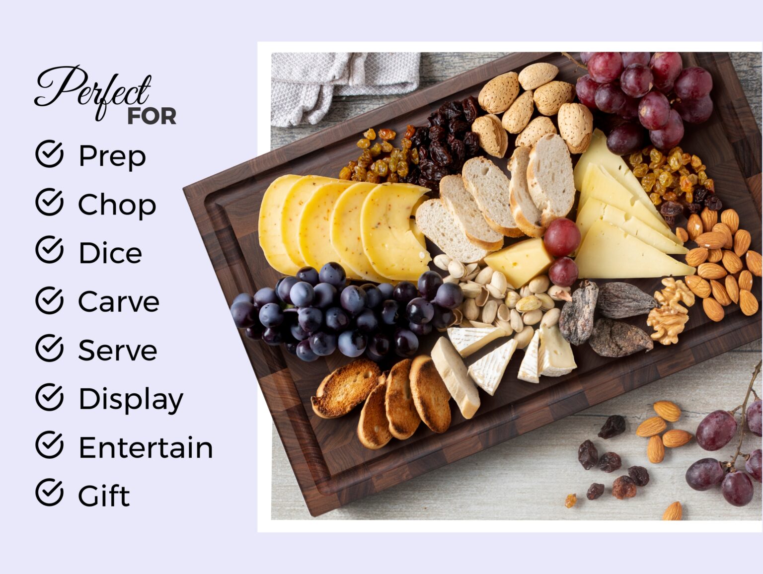 Enhanced Stability: The butcher block-style, 1.75-inch thick board is equipped with rubber feet for a secure grip during chopping. Integrated finger grips make lifting and transferring from kitchen to table effortless.