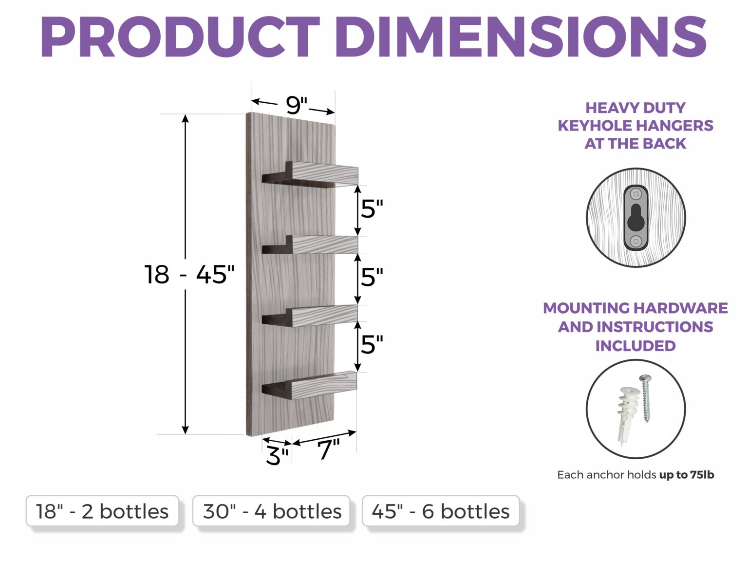 All sizes have a width of 9”. For the number of shelves that come with each height, see below: